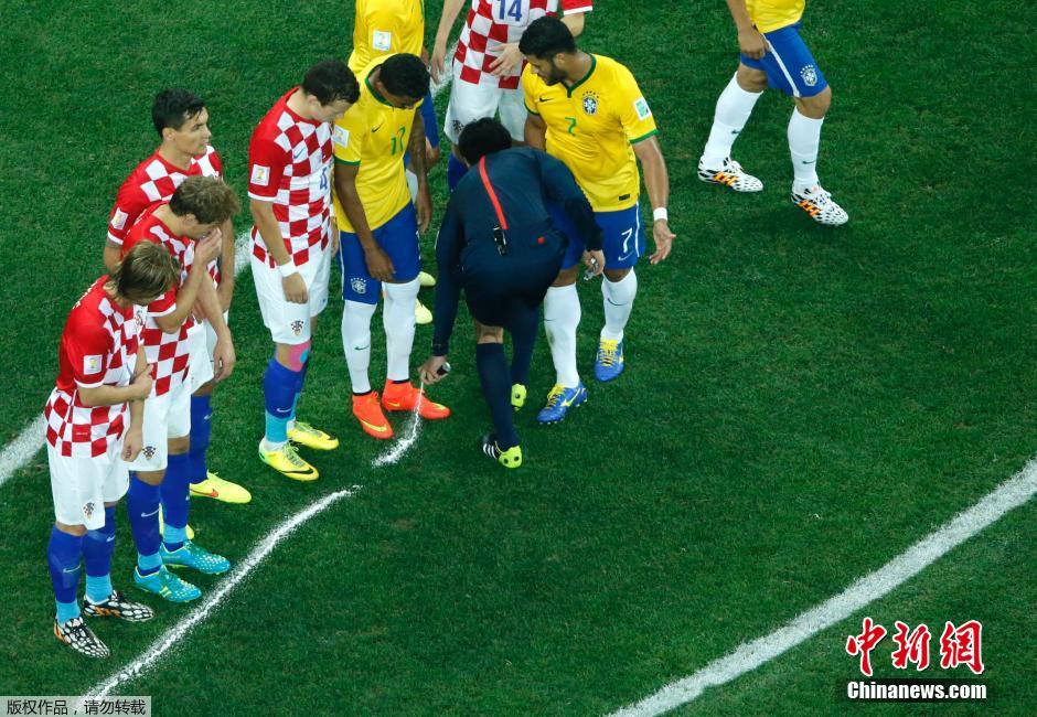 北京时间6月13日凌晨4点,2014年巴西世界杯揭幕战在圣保罗竞技场展开,东道主巴西迎战克罗地亚队。人墙喷雾首度启用。