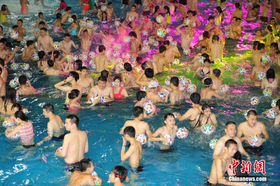 6月12日晚,深圳欢乐谷拉开水上足球狂欢大幕,千余足球爱好者暨游客在欢乐谷玛雅水公园海滩展开足球之战,迎接巴西世界杯开幕。本次狂欢节将持续到8月31日,深圳市民和游客在此度过激情仲夏之夜。中新社发 陈文 摄