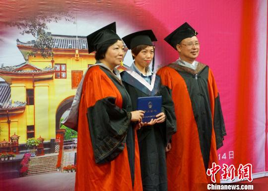 图为广西师范大学党委书记王枬、副校长蔡昌卓向越南驻华大使阮文诗孙女谢氏玉河颁发毕业证书。中新社发 赵琳露 摄