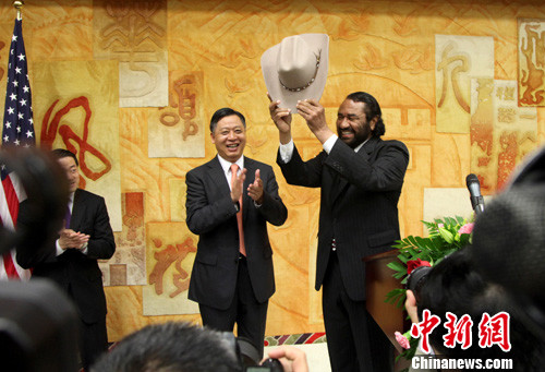当地时间6月13日,美国联邦众议院艾尔·格林向履新的中国驻休斯敦总领事李强民赠送得克萨斯州标志性的牛仔帽。中新社发 王欢 摄