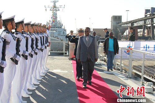 当地时间6月13日,中国海军第十六批护航编队结束对纳米比亚的友好访问,从沃尔维斯湾港启航,前往南非继续执行访问任务。中新社发 李晓 摄