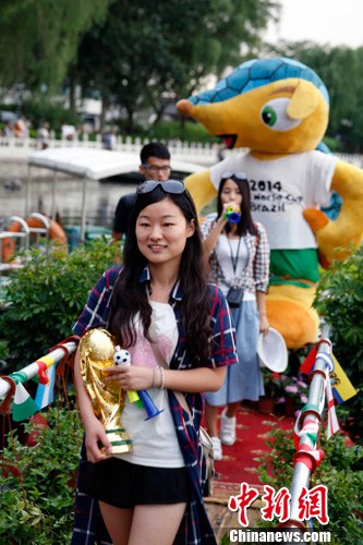 2014巴西世界杯已经拉开帷幕,并进入紧锣密鼓的比赛。这一全球的足球盛会同样吸引了国人的关注。因此,观赏巴西世界杯吉祥物“福来哥”、购买世界杯邮品、邀上亲朋好友齐聚酒吧观赏球赛等都成为民众生活的一部分内容。在北京著名旅游之地什刹海的野鸭岛,市民可以零距离接触巴西世界杯吉祥物“福来哥”,并在岛上设立了临时邮政局,现场加盖邮政戳,留作永久纪念。2014巴西世界杯吉祥物“福来哥”,其原型为巴西犰狳,是巴西特有的物种。犰狳在感受到外部威胁时,它就会缩成一团,用甲壳保护自己,此时形态同足球相似。 中新社发 任海霞 摄