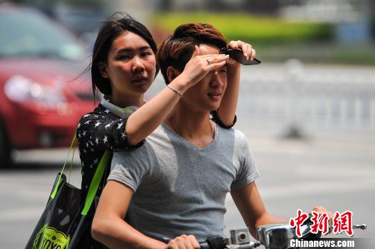 6月14日,广西南宁市最高气温达36摄氏度,南宁市武鸣县气象局于当日中午时分发布高温橙色预警信号,提醒民众将要出现37度高温,注意防暑降温。许多在户外驾驶电动车的骑手们为了防晒,采用的遮阳方式各不相同。图为在户外骑行的市民。 洪坚鹏 摄