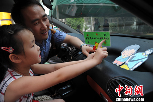 6月14日,琥珀第一幼儿园的小朋友给父亲的汽车上摆上“不酒驾”的小贴士。中新社发 韩苏原 摄
