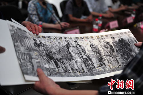 6月14日,工作人员在展示精装本1200米抗战历史画卷《浩气长流》。中新社发 于海洋 摄
