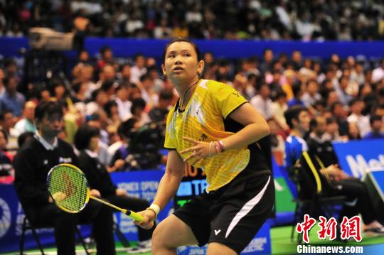 在14日进行的2014日本羽毛球公开赛女子单打半决赛中,两岸高手李雪芮、戴资颖双双战胜各自对手,进入决赛,将在15日的决赛中上演一场“海峡德比”。图为中华台北队戴资颖在半决赛中2比1战胜中国队选手刘鑫。王健 摄