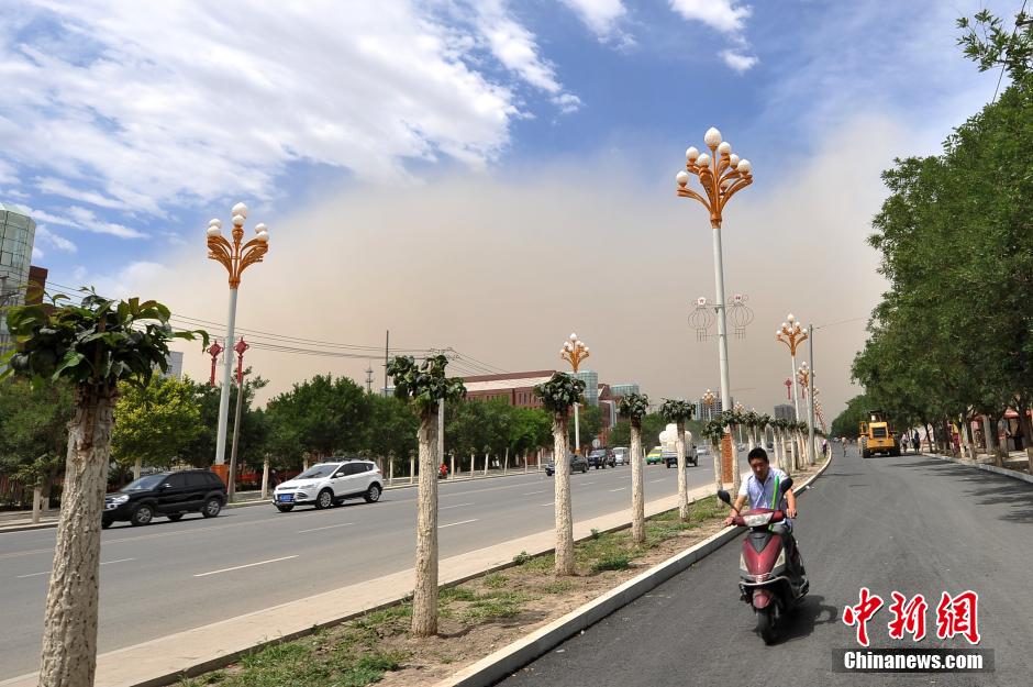 6月14日,一股强沙尘暴自北向南突袭新疆哈密市,几分钟前还是晴朗多云的哈密市瞬间被沙尘笼罩。中新社发 李华 摄
