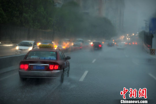 6月17日,广州午后遭暴雨突袭,白昼如夜。广东气象局通报称,受“海贝思”残余环流影响,16日08时至17日08时,全省共有3个气象站录得100—250毫米的大雨,未来几天广东雨势明显。图为受到暴雨袭击的广州。中新社发 陈骥旻 摄