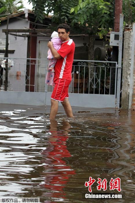 巴拉圭河近日持续涨水,导致周边居民区遭遇水浸,大约16万人受灾。图为6月17日,巴拉圭亚松森被水淹没的街道。