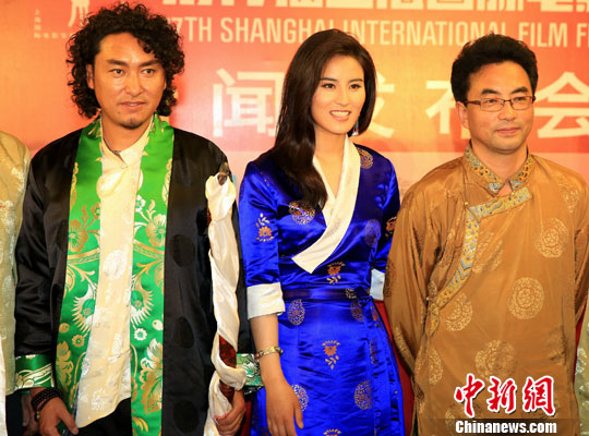 6月17日晚,第17届上海国际电影节金爵奖参赛片、中国影片《五彩神箭》的导演万玛才旦(右),携男女主角仁青顿珠、德姬等亮相上海国际电影节发布会,该片围绕民族传统射箭邀请赛展开故事,展示了新时代藏族人的精神。此次电影节,《五彩神箭》是中国仅有两部参赛影片之一,其实力备受媒体关注。