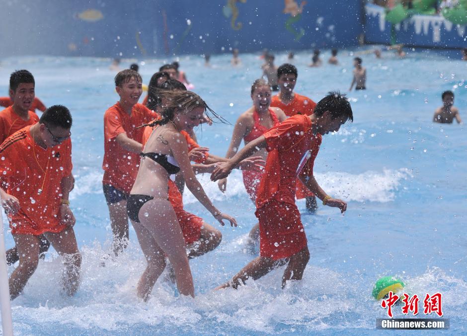 6月17日,重庆洋人街水上乐园的游客正在进行水上足球比赛。2014世界杯足球赛正在巴西举行,洋人街水上乐园举行为世界杯加油助威足球互动赛事,吸引不少重庆市民前来参加。陈超 摄