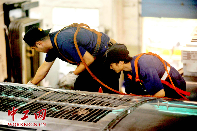 检修好的空调机组最后要吊运到高达5米的列车顶部,进行最后的安装调试。龙阳波和程杰在车顶上如履平地,动作娴熟地安装空调机组。