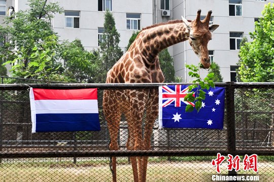 6月18日,随着2014年巴西世界杯足球赛渐入佳境,济南动物园长颈鹿“大壮”不甘寂寞争当“预测帝”,它预测首场比赛失利的澳大利亚男足将在小组第二场比赛中“辣手摧花”,战胜“橙色郁金香”荷兰队。