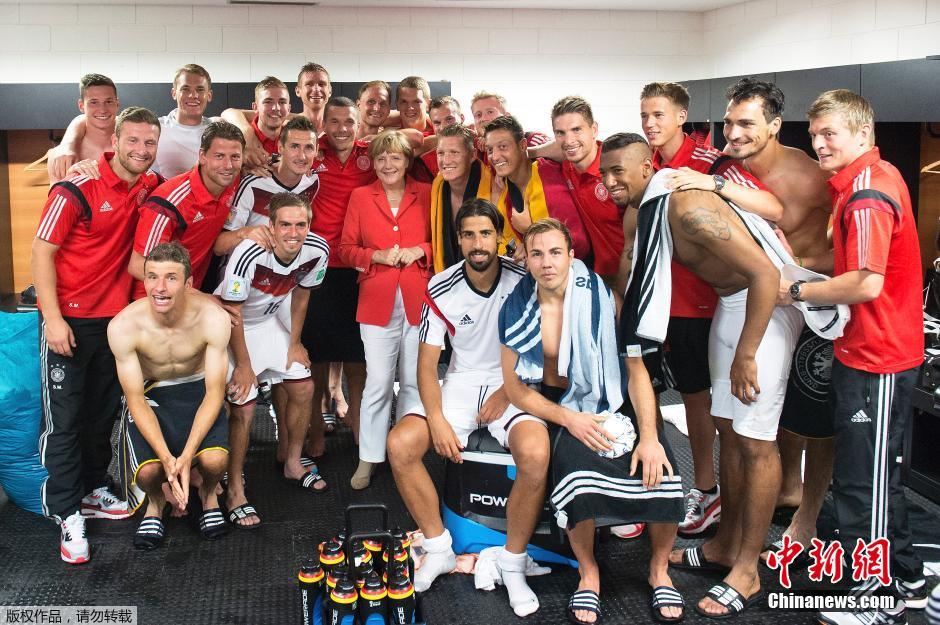 6月17日,德国队4-0大胜葡萄牙,德总理默克尔在赛后进入德国队更衣室和球员一起庆祝胜利。