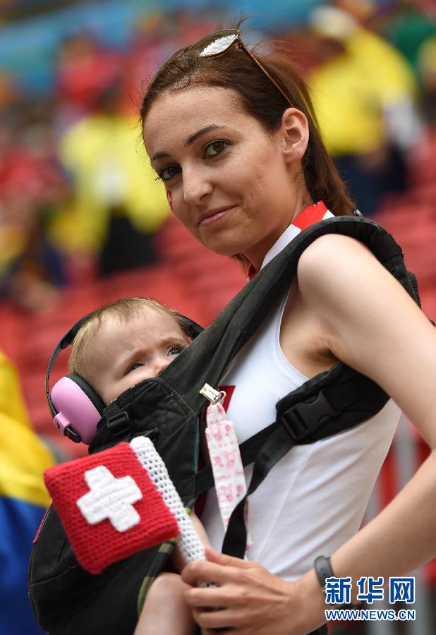 6月15日,一名瑞士队美女球迷带着孩子等待比赛开始。当日,在巴西巴西利亚马内•加林查国家体育场进行的2014年巴西世界杯小组赛E组比赛中,瑞士队对阵厄瓜多尔队。 新华社记者刘大伟摄
