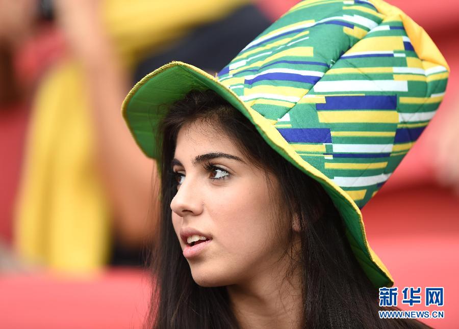 6月15日,一名女球迷等待开赛。 当日,在巴西阿莱格里港河滨球场进行的2014年巴西世界杯小组赛E组比赛中,法国队对阵洪都拉斯队。新华社记者李尕摄