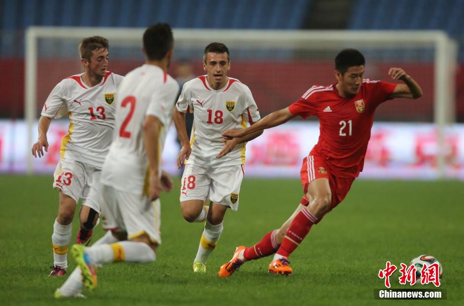 6月18日,球员在比赛中。当日,国足在沈阳2-0战胜马其顿队,佩兰赢得执教首胜。中新社发 于海洋 摄