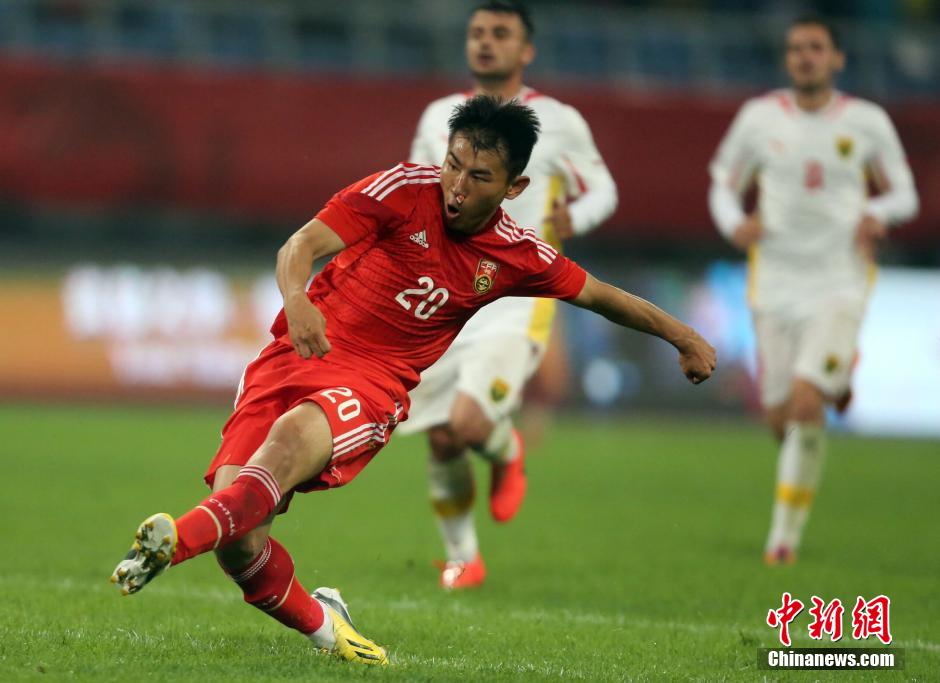 6月18日,球员在比赛中。当日,国足在沈阳2-0战胜马其顿队,佩兰赢得执教首胜。中新社发 于海洋 摄