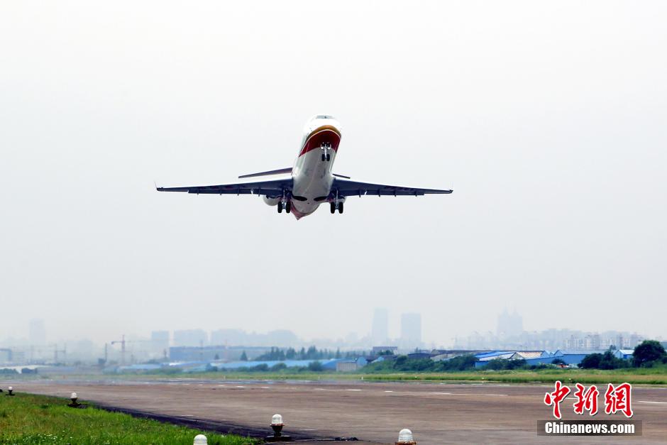 6月18日,中国ARJ21-700新支线飞机105架机在上海完成第一次飞行,该机是即将交付首家用户成都航空公司的第一架飞机。图为飞机制造商中国商用飞机有限责任公司提供的ARJ21-700飞机105架机完成首飞正准备安全降的画面。据悉,该架飞机于2013年12月30日总装下线,2014年6 月10日转入试飞站,6月14日,成功进行了两次低速滑行和两次中速滑行,6月18日进行高速滑行和第一次飞行,当日首飞共飞行2小时08分,完成了预定各项检查任务,飞机各项性能良好。中新社发 钟欣 摄