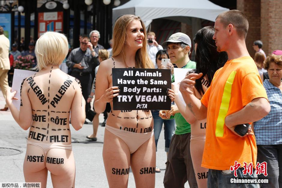 当地时间6月18日,加拿大渥太华,善待动物组织的活动家身着内衣,在街头进行抗议活动。他们的身体上标有模拟动物部位的字样,抗议渥太华年度特色烤肉节中消费肉类。