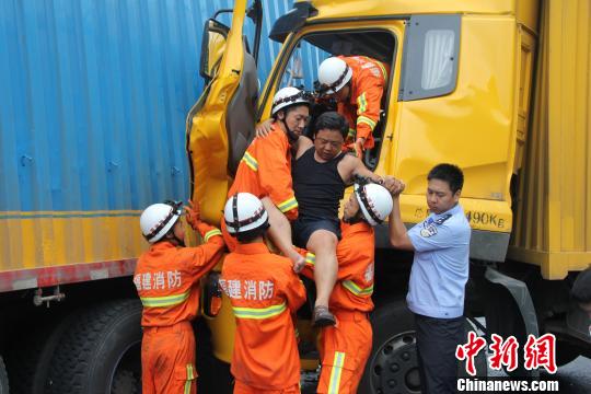 6月19日,沈海高速公路丹阳往连江方向三辆大货车发生连环追尾事故,造成其中一名驾驶员受伤被困。