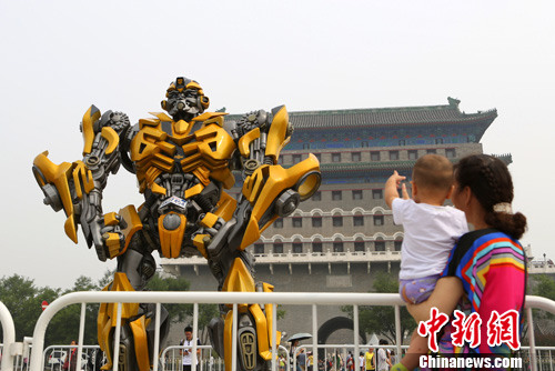 6月19日,“大黄蜂”亮相北京前门大街,吸引游客驻足。中新社发 李慧思 摄