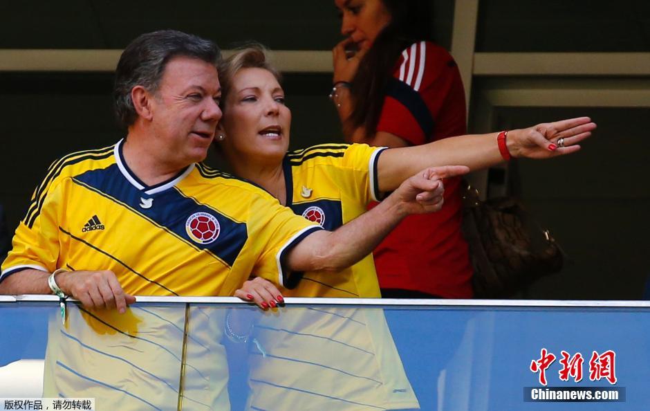 2014世界杯C组第二轮,哥伦比亚对阵科特迪瓦,首轮两队分别取胜,本场比赛取胜的一方将极有可能锁定小组第一。哥伦比亚总统桑托斯和妻子在场边观看球队比赛。