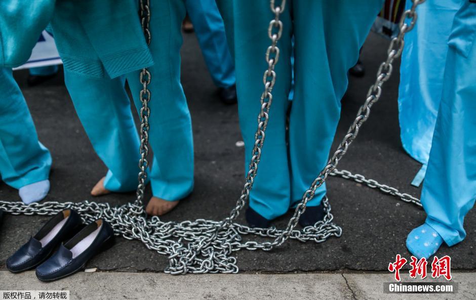 当地时间6月19日,秘鲁利马,护士戴铁链在拉丁美洲国际劳工组织办公室前举行罢工,要求涨薪和改善工作环境。