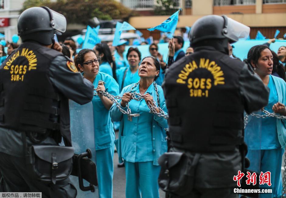 当地时间6月19日,秘鲁利马,护士戴铁链在拉丁美洲国际劳工组织办公室前举行罢工,要求涨薪和改善工作环境。