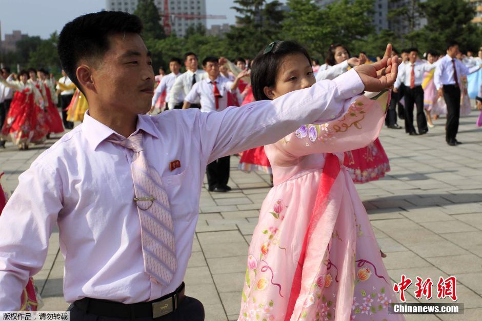 当地时间6月19日,朝鲜平壤,在纪念金正日开始在党中央工作50周年庆祝活动上,朝鲜学生在建党纪念碑前的广场上跳舞。