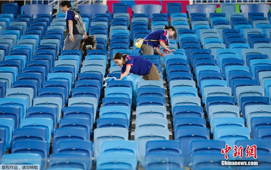 当地时间6月19日,纳塔尔沙丘球场,2014巴西世界杯小组赛C组,日本0-0希腊。尽管对比分不是特别满意,但是日本球迷在退场时还是冒雨主动收拾身边的垃圾,展现出了球迷的高素质。