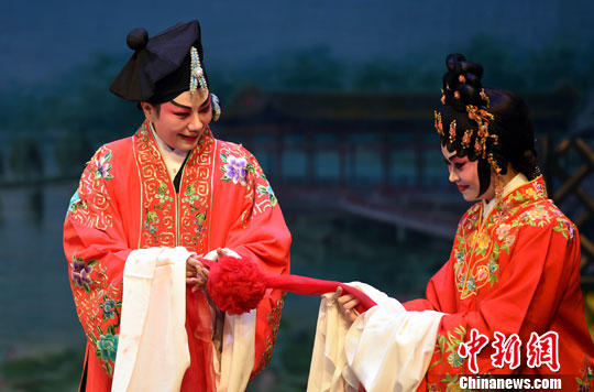 图为演员司徒翠英(左)、王洁清表演《白兔会》。中新社发 张宇 摄
