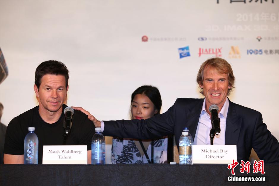 图为迈克尔·贝(右)携主演马克·沃尔伯格(左)出席中国媒体见面会。张亨伟 摄