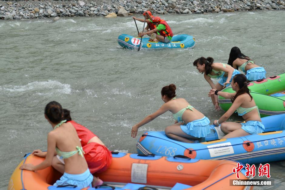 6月22日,“中国漂流小镇”—四川都江堰虹口举行国际漂流赛,美国、加拿大、新西兰、匈牙利、塞尔维亚等6支国际漂流高手队伍和中国精英漂流队在此展开角逐,加拿大队最终以27分13秒荣获漂流大赛冠军。比赛时,身着比基尼的美女一路助兴,成为赛事之外的又一大焦点。中新社发 张浪 摄