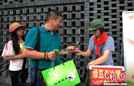 6月22日,一怀旧打扮的推销员在成都宽窄巷子特色街区推销产品,受到过往民众热捧。中新社发 安源 摄