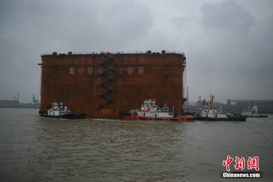 沪通铁路长江大桥的第28号墩钢沉井22日从船坞启运,经过多艘拖轮顶托约11公里后顺利抵达桥址。该沉井平面尺寸相当于12个篮球场大小,高度达115米,是世界上规模最大的深水沉井基础。图为当地海事部门护送下28号墩钢沉井在长江江面缓缓移动。林先波 摄