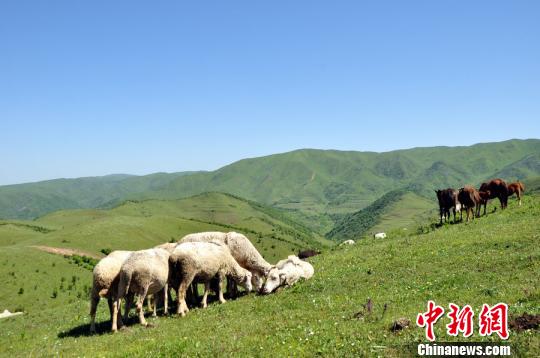 盛夏时节,甘肃张家川回族自治县白石咀牧场天高云淡,草长莺飞,牧场上羊叫马欢。白石咀牧场主山峰海拔约2300米,是优良的夏季牧场,也是张家川县唯一的浅滩草坪保护区。