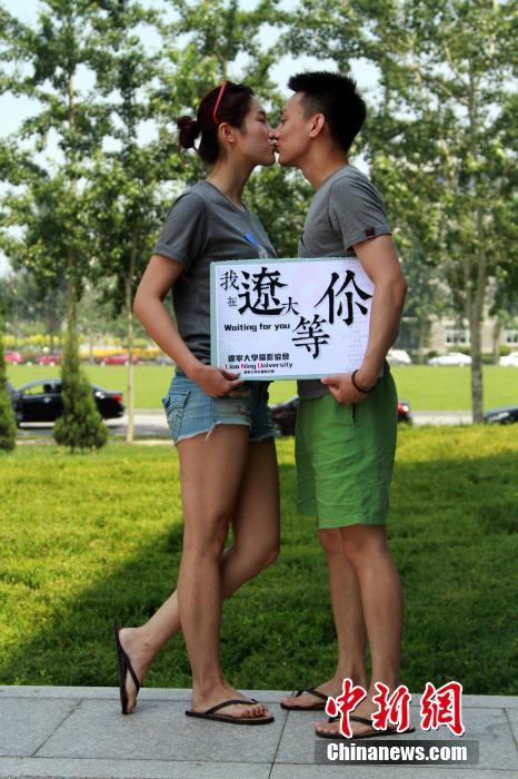 6月23日,一位女生拿着“我在辽大等你!”的牌子拍照。当日,辽宁大学摄影协会推出一组辽大创意“招生名片”的图片,数位帅哥靓妹抓人眼球。中新社发 于海洋 摄
