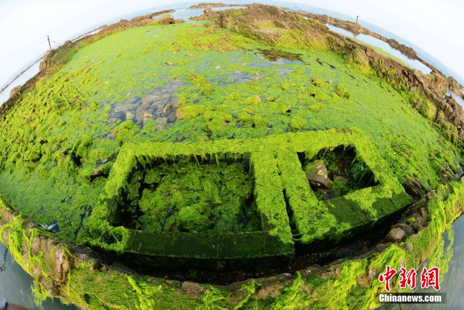 6月23日,部分浒苔随着潮流漂进青岛八大峡一带水域。为此,青岛市已启动浒苔灾害四级应急响应,建立空中卫星遥感、海上巡航监测、陆上沿岸巡查、实时视频监控“四位一体”的监视监测体系,并根据浒苔分布和发展态势,研发海上浒苔处置平台,组织90艘渔船作为应急打捞船队,110艘渔船作为应急打捞预备队,在重点海域安装拦截网1.67万米,对上岸浒苔实施有效清理,力保近岸重点旅游区不受浒苔影响。自2007年以来,青岛已连续8年遭遇漂流而来的浒苔侵害,并给当地养殖、旅游等行业带来严重影响。中新社发 王海滨 摄