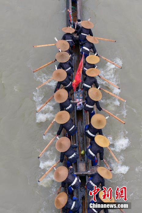 图为苗族村民在进行龙舟竞渡。中新社发 乔啟明 摄