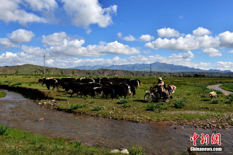 甘肃祁连山下大批牛羊夏季“转场”忙