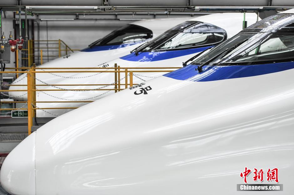 6月24日,记者探访南宁动车所,这里是南宁铁路局开行所有动车的日常检修基地,为每日驰骋在八桂大地上的“和谐号”进行“身体检查”、“诊断治病”。据悉,这家动车“诊所”于2013年9月开业,三个月后,西南边陲省份——广西第一列动车开行。图为南宁动车所内等待检修的动车组。洪坚鹏 摄