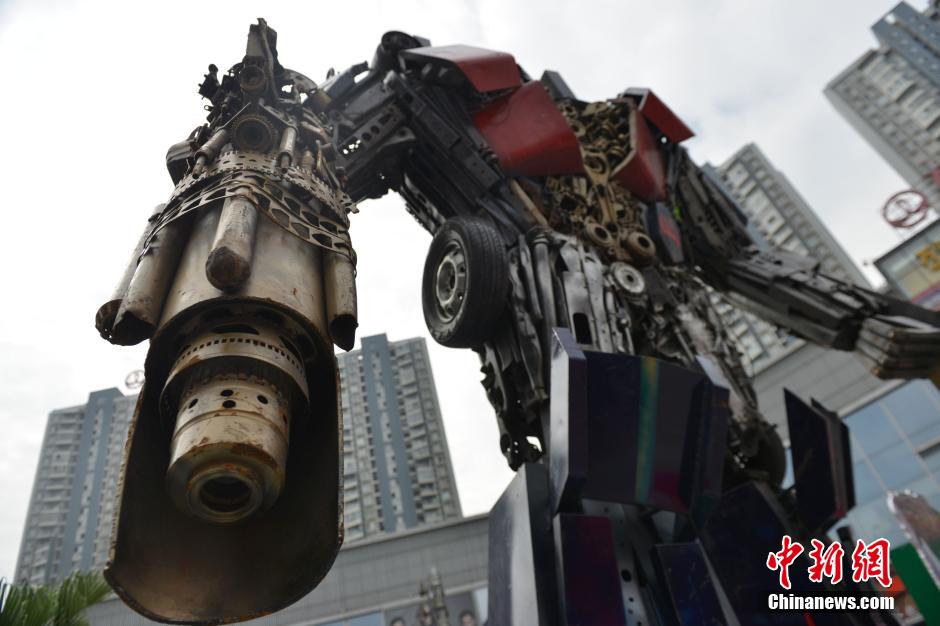 成都废旧汽车零件打造的“变形金刚”亮相街头