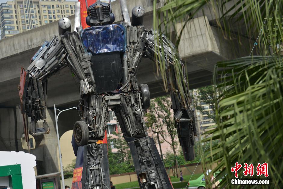 成都废旧汽车零件打造的“变形金刚”亮相街头
