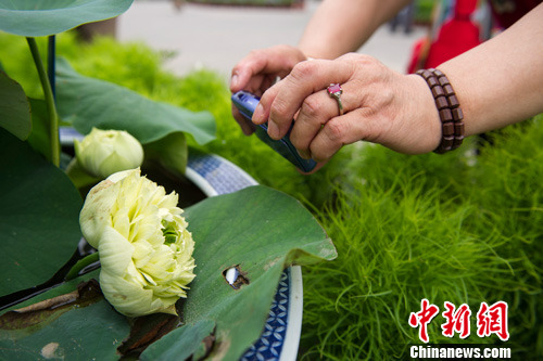 6月25日,罕见的黄绿色“绿如意”荷花亮相荷花展。中新社发 崔楠 摄
