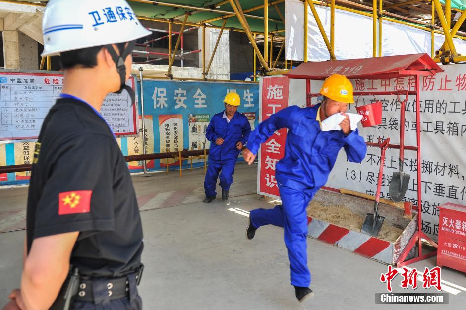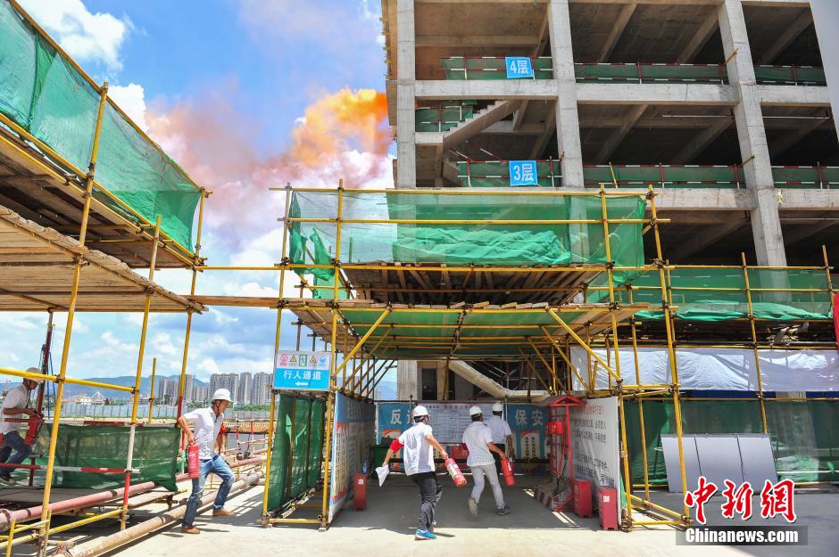 6月26日,中建三局昆明一地产项目处举办了一场应对突发性建设工程领域安全生产及消防应急演练,模拟一工地发生火灾,脚手架倒塌造成人员伤亡,检验其对发生事故的应急处理能力。据介绍,6月是中国安全生产月,该活动旨在提高当地建设工程领域对突发应急事故的处置能力。中新社发 任东 摄