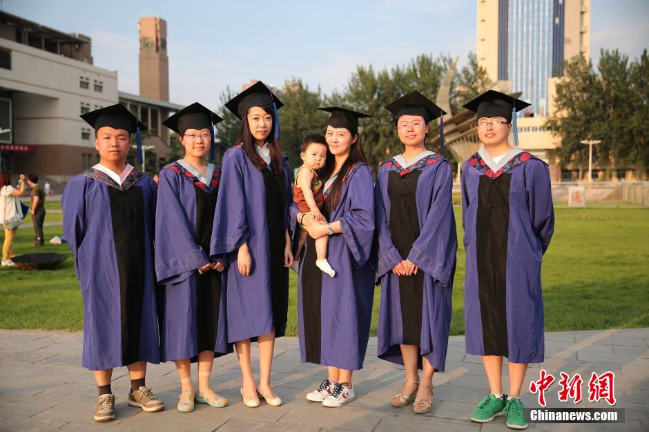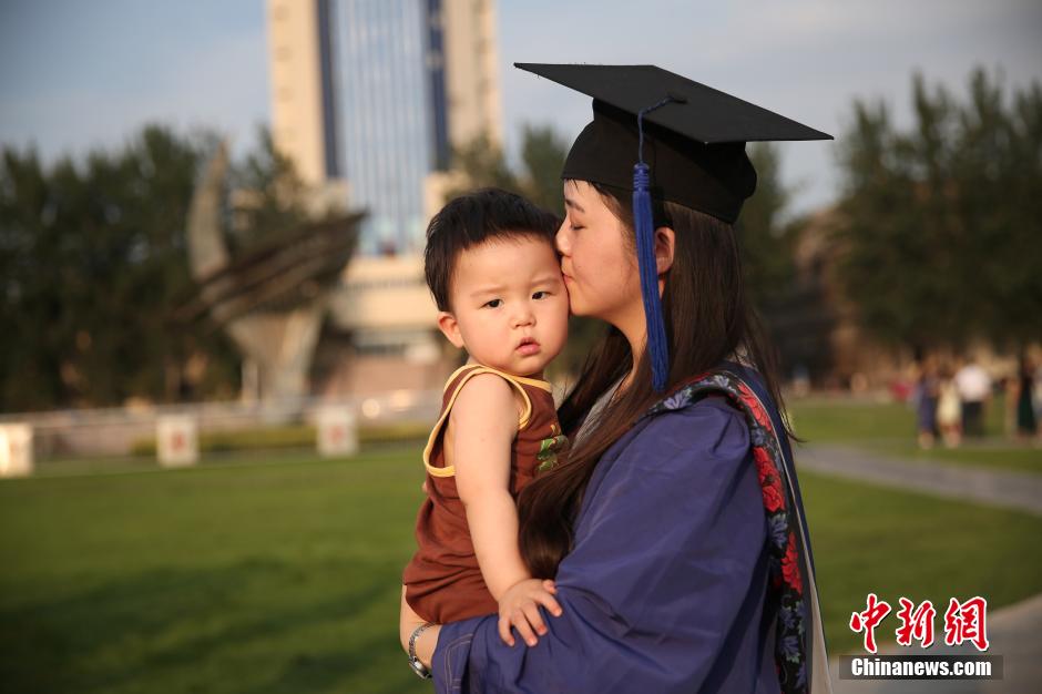 6月26日,山西大学举行研究生毕业典礼,该校历史文化学院的硕士毕业生王文娟,抱着1岁大的儿子与其老公一起前来参加毕业留影,引人注目。中新社发 武俊杰 摄