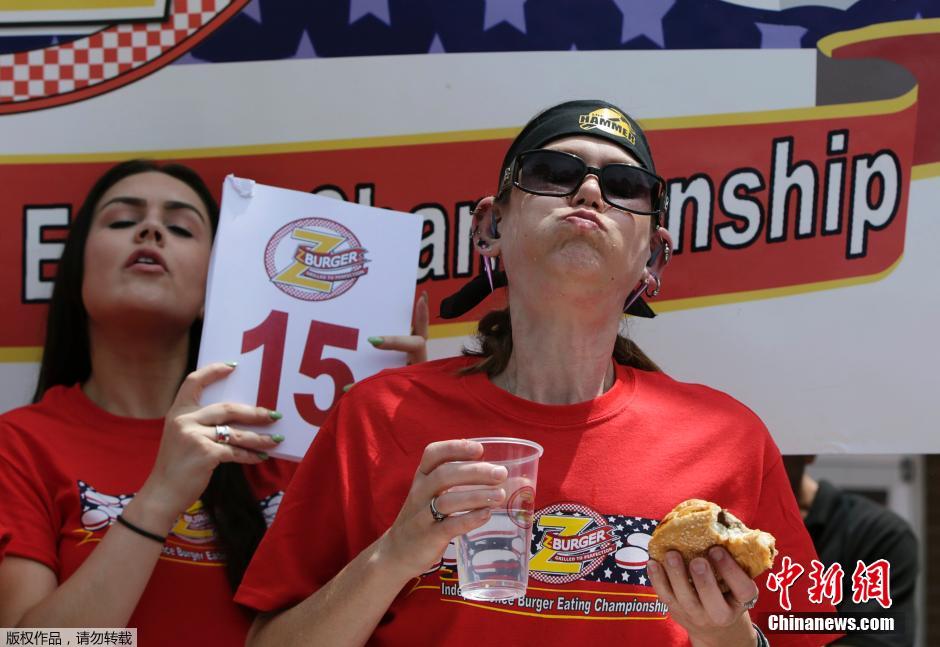 美国举办吃汉堡比赛 女汉子10分钟消灭26个汉堡