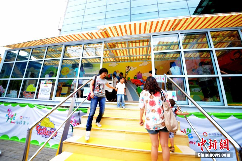 7月5日,“集装箱图书馆”亮相在苏州举办的一场书展户外展台,其造型独特吸引了众多市民的目光。据了解,集装箱图书馆是苏州图书馆最新推出的流动书屋服务项目,专门针对0-3岁婴幼儿“悦读宝贝流动书屋”和针对7-12岁小朋友的“少年儿童流动书屋”,以及外来务工人员。中新社发 王思哲 摄