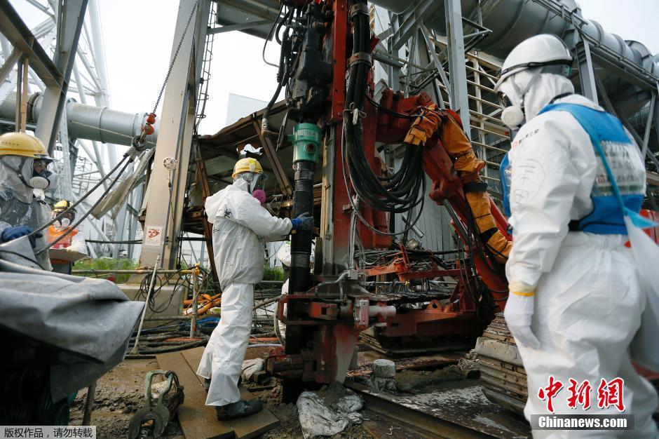 当地时间2014年7月9日,日本福岛县,东电员工在受损的福岛第一核电站附近建筑冰墙并邀请媒体观看。TEPCO已开始在核电站下为巨大的管网挖掘壕沟,打算通过它来注入制冷剂。制冷剂是冷却至零下30度的氯化钙溶液。制冷剂将冻结土壤并形成物理屏障,防止流下山坡的干净地下水与反应堆泄露的受污染水混合。